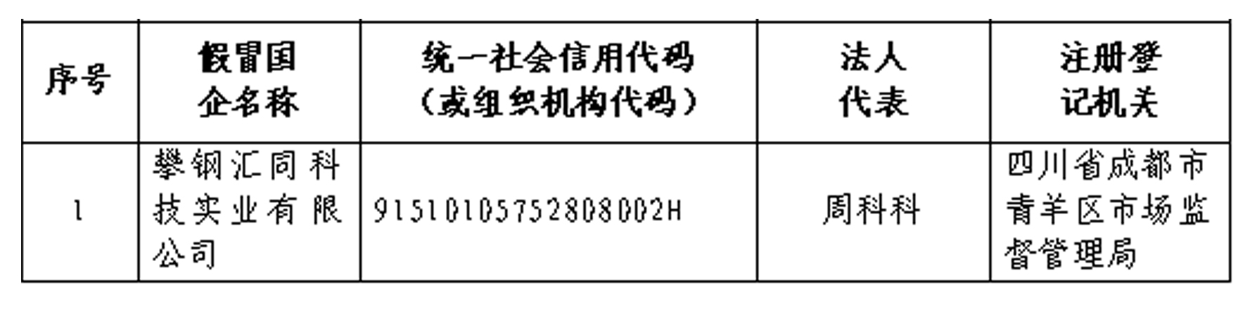 按照國務院國資委打擊假冒國企專項行動工作部署,鞍鋼集團有限公司(以下簡稱鞍鋼集團)全面開展排查工作,并于2022年6月10日-2022年6月15日在鞍鋼日報、鞍鋼集團官網、搖籃鞍鋼微信公眾號等平臺發布線索舉報公告。經排查核實,攀鋼匯同科技實業有限公司對外虛假宣傳為鞍鋼集團全資子公司攀鋼集團有限公司的下屬子公司,屬于假冒國企行為。